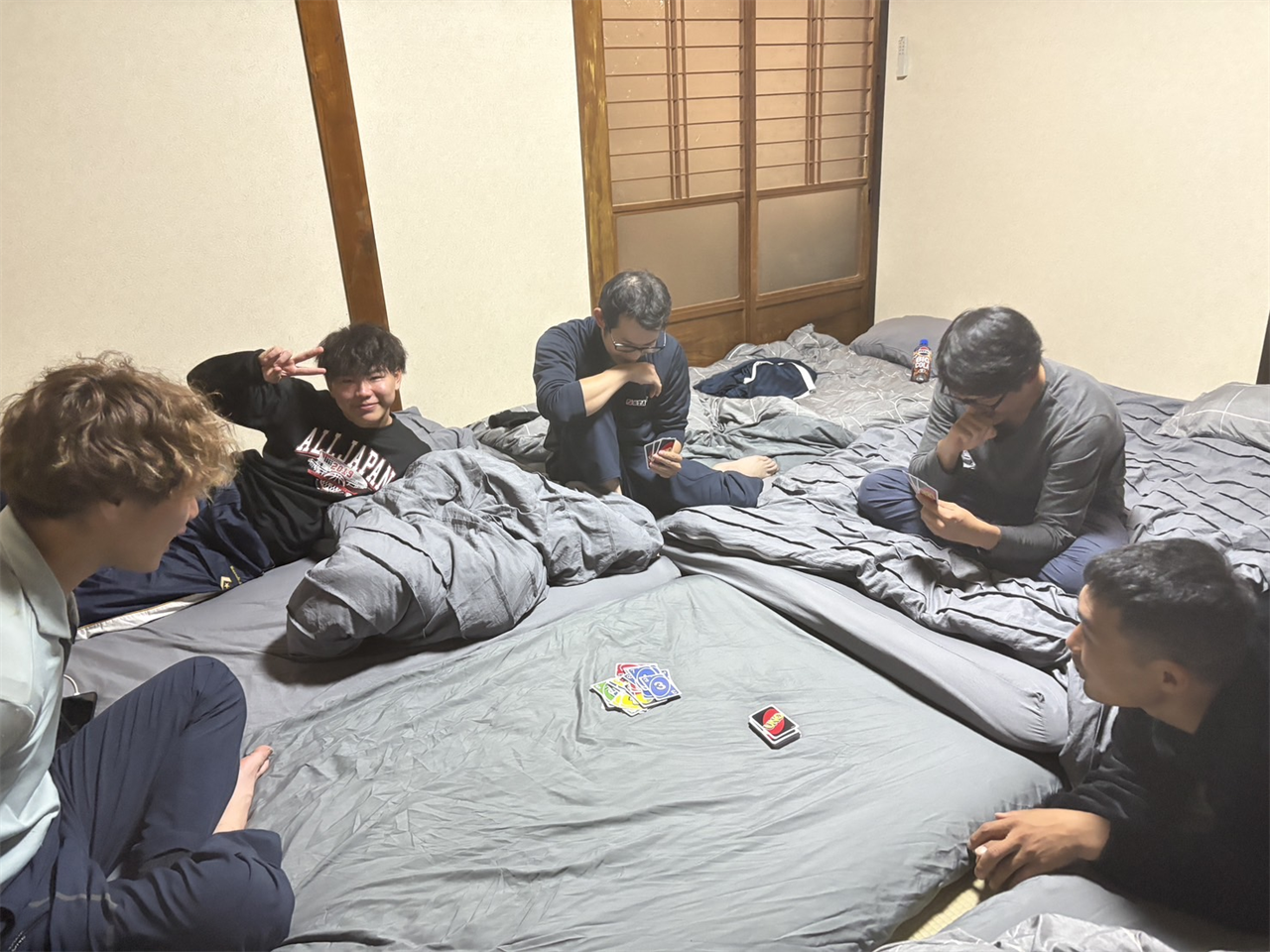 夜は合宿のように布団を並べて、UNO大会となり大盛り上がりでした。